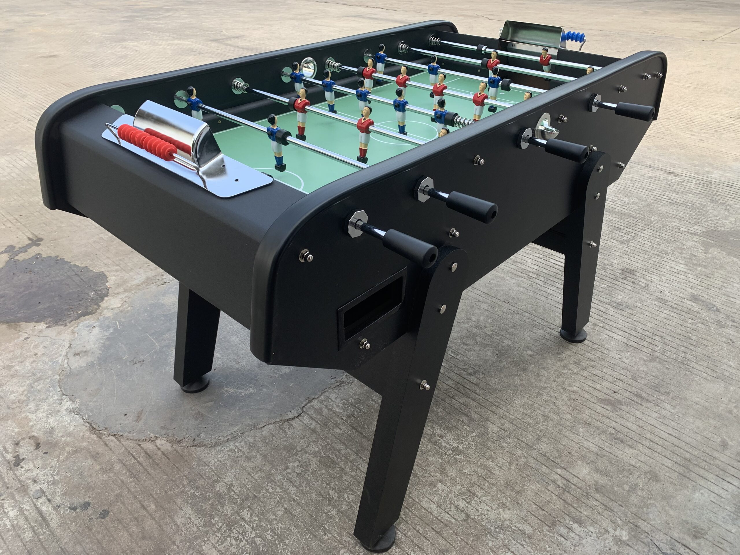 . Table Size:150x75x91cm . Material: MDF with Black PVC laminated . Goal:Chromed,Players:Blue and Red . Playfield:Gerflex Size:1206*700MM . Rods:14mm seamless steel tube with plastic tube in the rod . Players: Metal(will be assembled by the factory) . Handle:Black Plastic . Accessories: 2pcs balls . Goal material:Metal with chromed,Rubber:Red